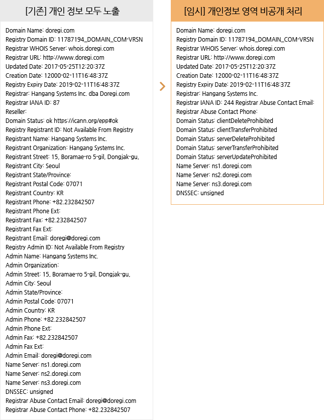 °³ÀÎÁ¤º¸ ¼öÁý, ó¸®, ÀÌÀü ¹× Å뺸¿¡ ´ëÇÑ ÇÁ¶óÀ̹ö½Ã ±ÔÁ¤ÀÌ °ÈµÊ¿¡ µû¶ó µµ¸ÞÀÎ Á¤º¸(WHOIS) Á¶È¸ ½Ã Ç¥±âµÇ´ø °³ÀÎ Á¤º¸ ¿µ¿ªÀÌ ºñ°ø°³ ó¸® µË´Ï´Ù.